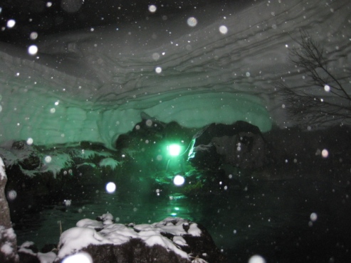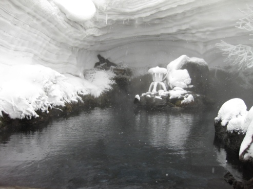 露天風呂に今年も巨大雪庇が出現し、入浴客は自然が織りなす
