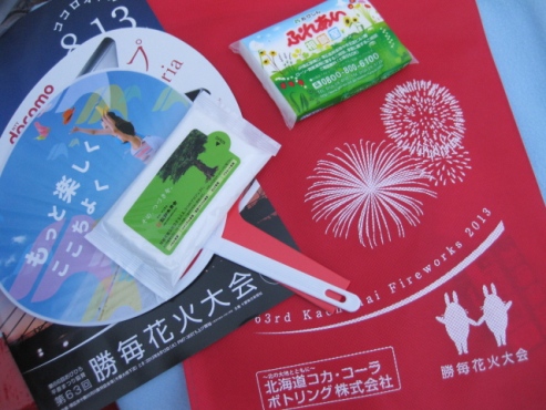 赤い袋の中には勝毎花火大会のパンフレット、うちわ(2)、